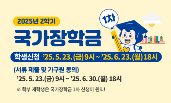 2025학년도 1학기 국가장학금 1차 신청 마감일은 6월 23일(일) 오후 6시까지입니다. 국가장학금은 1학기와 2학기로 나누어 신청하지만, 1차 신청 시 2학기까지 연계되므로 반드시 이번 기회에 신청하는 것이 유리합니다.