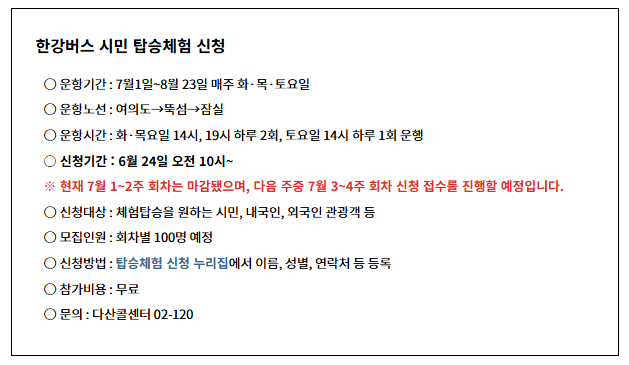 ‘한강버스’ 무료 탑승 체험은 2025년 6월 24일(월)부터 순차적으로 운영됩니다. 하루 2회 왕복 운행되며, 사전 신청자에 한해 무료로 탑승할 수 있습니다. 한강버스 시민체험단 ‘얼리버드’ 참가 신청은 24일 오전 10시부터 모집하며, 탑승을 원하는 시민 또는 내국인, 외국인 관광객 누구나 PC나 스마트폰을 통해 탑승체험 신청 누리집에서 이름과 성별, 연락처 등을 등록하면 된다.
