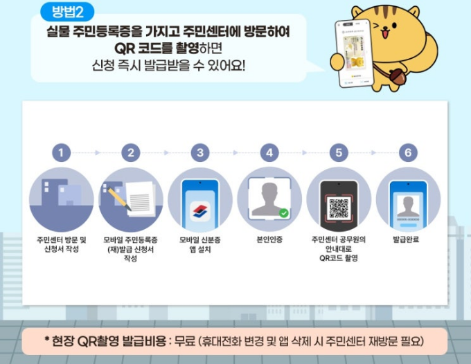 이 방법은 실물 주민등록증만 있다면 누구나 손쉽게 발급받을 수 있으며, QR코드를 활용해 현장에서 바로 등록할 수 있다는 장점이 있습니다.