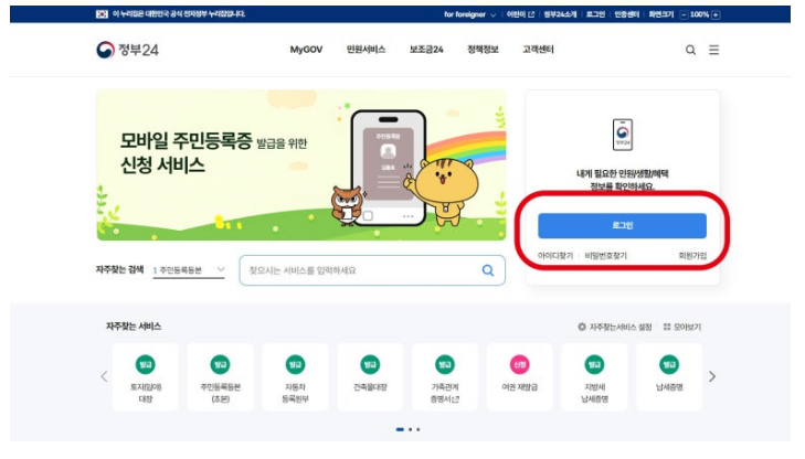 - 모바일 주민등록증 발급 후 정부24에서 로그인이 가능합니다.