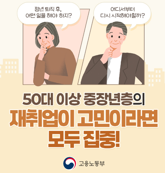 퇴직을 고민하시는 분, 커리어 전환을 꿈꾸는 중장년이라면 중장년내일센터 또는 고용24 홈페이지에서 지금 바로 신청하세요